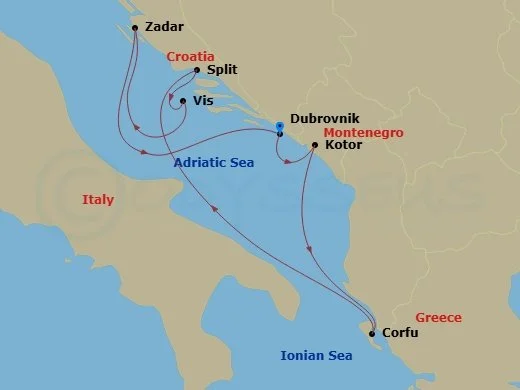 This journey opens and closes in Dubrovnik, the shimmering Adriatic gem where medieval walls meet sunsets the colour of gold. From there, you’ll sail to Montenegro’s fjord-like Kotor, where Venetian charm weaves through cobbled streets. Corfu awaits with its lush hillsides and aristocratic palaces, before a day at sea to indulge in the quiet elegance of life on board. In Split, the echoes of Diocletian’s Palace spill into a lively waterfront, while Vis offers a rare taste of untouched island life, all vineyards, olive groves, and glass-clear waters. Zadar brings a final flourish, where Roman ruins meet modern marvels like its hauntingly beautiful sea organ, before returning to Dubrovnik’s timeless embrace.